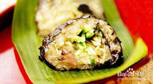 将肉粽用勺子碾松,肉馅与米分开。寿司帘上铺上紫菜、粽子米、熟肉馅、苹果丝和黄瓜丝,最后用寿司帘将粽子寿司卷紧,切断即可。那味道竟然出奇的好,比单吃肉粽子口感更加丰富。其中粽子寿司内所加的配料,童鞋们可以根据自己的喜好随意搭配哦!